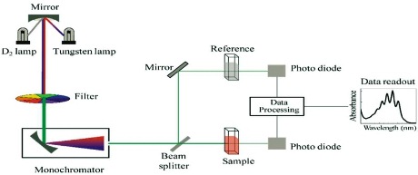 A UV–VIS–NIR Spectrophotometer basically consists of a light source, a monochrometer, a sample compartment, and a detector as shown in Figure 9 (Otto-Schott-Strabe, 2010). The most commonly used light sources are halogen lamps used for the visible and near-infrared regions and the deuterium lamps used for the ultraviolet region. Monochromatic light of different wavelengths ranging from Ultraviolet to Infrared are produced by using either a prism or a diffraction grating as the dispersive element. This monochromatic light is then incident on the sample, the intensity of light reflected or transmitted through the sample is detected. Photomultipliers and silicon photodiodes are typical detectors used for the ultraviolet and visible regions while for the near-infrared region, PbS photoconductive elements or InGaAs photodiodes are being used.