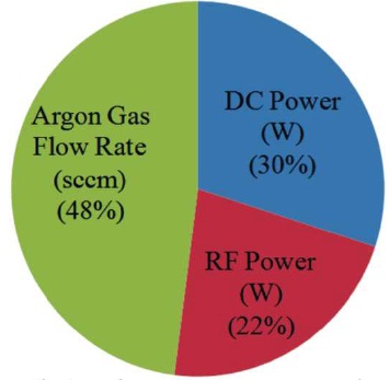 It clear from Figure 10 that DC power has 30% of contribution, RF power has 22% and argon gas flow rate has 48% of contribution and is higher among all three deposition parameters. Hence in achieving higher solar absorptance of metal-ceramic thin films, it is essential that argon gas flow rate should be maintained as minimum as possible. While RF power should be maintained high and moderate value for DC power is preferable. Hence from Table 7 and Figure 10, the optimized deposition parameters are DC power to be 750 W, RF power to 950 W and argon gas flow to be 250 sccm to achieve an absorptance greater than 0.75.