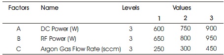 Based on the process parameters identified for sputtering, the experiment plan is prepared so that sputtering process is carried out at different conditions to observe effects of these conditions on thin film properties. The experimental plan is achieved on the basis of Taguchi L9 orthogonal array is shown in Table 5 (Montgomery, 2017). Based on the below Table 5, the experimental plan as derived from L9 orthogonal array is represented in Table 6. The various levels for deposition parameters are selected based on consistency of deposition machine. Since the DC Power, RF Power and Argon gas flow rate are process parameters, the experiments are carried out with different combinations to obtain the optimized conditions after characterizing and analysing deposited thin films. Taguchi layout is used in the estimation of percentage effects of each parameters on thin film properties.
