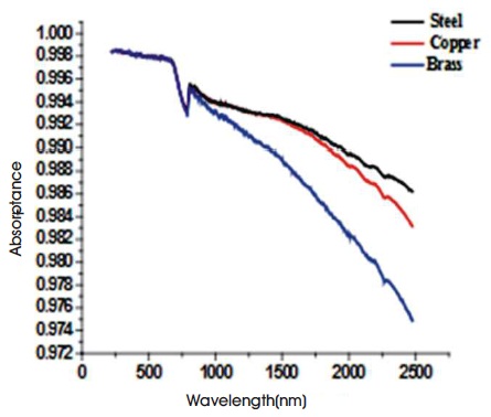 Figure 2. Absorption Spectrum of Black Nickel on Brass, Copper and Steel Substrates as a Function of Wavelength (Ghasempour & Rozati, 2011)