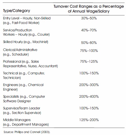 Employee turnover is expensive (Alkahtani, 2015; Choudhary, 2016; Figueroa, 2015; Ugoani, 2016; Wang et al., 2014). Employers can spend millions of dollars on employee turnover costs annually. After loosing an employee, an organization will have to consider recruitment, advertisements and training expenses. Recruiting, hiring and training a new comer may total 50% to 200% of the employee's annual salary (Leider et al., 2016). According to Shahin (2014), it takes 250% of a worker's salary to replace that worker. Additionally, if an employee is dismissed, the company may have to bear gratuity, separation packages or vacation payments. Phillips and Connell (2003) encapsulated from studies they conducted a listing of turnover costing for types of positions in the workforce (see Table 1). The positions are outlined by category starting with the entry level to middle management. The percentages represent how much it would cost an organization to replace an employee.