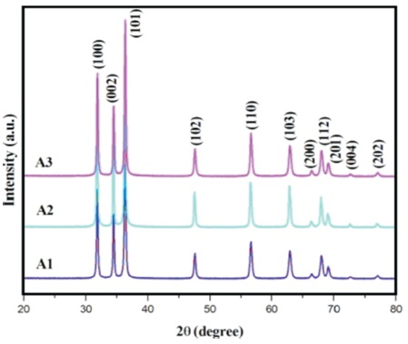 All chemical reagents of analytical grade were used for the synthesis of ZnO nanorods. In the typical synthesis, the required amount of zinc acetate dehydrate has been dissolved in deionized water in three separate beakers for 30 minutes under vigorous stirring. Three different amount of hydrazine hydrate solution such as 0.4 ml, 0.6 ml and 0.8 ml has been added into the precursor solution. The pH of the solution has been adjusted to 12 by adding NaOH drop by drop and magnetically stirred for 30 minutes. Finally, the solution has been transferred to a Teflon lined autoclave and the reaction has been carried out for 12 hours under 200 0C. After gradually cooling to room temperature, the precipitate has been collected from the autoclave and washed several times with deionized water and ethanol. The final product has been obtained by drying the synthesized sample in a hot air oven at 80 0C. The samples were labelled as A1, A2 and A3 for the 0.4 ml, 0.6 ml and 0.8 ml hydrazine hydrate solution respectively.