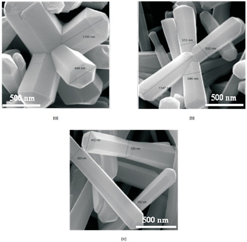 Figure 2 shows the field emission scanning electron microscopy (FE-SEM) images of the ZnO samples. The tetrapod morphology of ZnO has been obtained for the samples A1 and A2 as shown in Figure 2(a) and 2(b). In the tetrapod structures, each arm has different length and diameter but with a hexaognal cross section at their ends. This is in well agreement with the hexaognal phase of ZnO confirmed by the X-ray diffraction analysis. Figure 2(c) shows the dumb-bell shaped ZnO structures for the sample A3. By increasing the amount of hydrazine hydrate solution from 0.4 ml to 0.8 ml, the modified morphology and size of the ZnO structures has been observed.