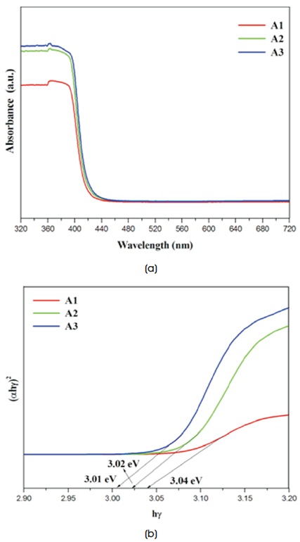 The red shifted optical absorption in the visible region is noticed for the synthesized samples with respect to the bulk ZnO (387 nm) from UV-vis diffuse reflectance spectrometer and is shown in Figure 3(a). The optical absorption is always associated with its band gap energy (Faisal et al., 2013). The band gap of the samples is estimated by extrapolation 2 of the linear curve obtained by plotting (αhγ2) versus hg and the calculated values of bandgap energy for the samples are as shown in Figure 3(b) (Omidi et al., 2014). From the obtained results, the energy gap of all the samples has small value than the commercially available ZnO which indicates that they could be better in the visible light active photocatalysis.