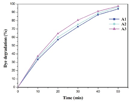 The photodegradation of methylene blue dye has been noticed as 90.86, 92.95 and 94.93% by the photocatalysts prepared with varying hydrazine hydrate solution amounts of 0.4 ml, 0.6 ml and 0.8 ml, respectively and is shown in Figure 4. From the obtained results, the photocatalyst A3 with dumb-bell shape exhibited the highest photocatalytic activity followed by the photocatalysts A2 and A1. The process of photodegradation of methylene blue dye can be explained as follows. The generation of excitons (electron-hole pair) in ZnO is caused by the irradiation of light onto the photocatalysts. Superoxide anion radicals are formed when the photo induced electrons in the conduction band of ZnO interact with oxygen molecules adsorbed on ZnO. Similarly, water dissociation causes the holes in the valence band of ZnO to produce hydroxyl radicals (Srinivasan et al., 2019). Furthermore, after the complete degradation process, highly reactive hydroxyl radicals and superoxide radicals can react with the organic dye methylene blue to produce harmless products (Sahoo et al., 2015; Srinivasan et al., 2019).