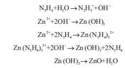 Hydrazine hydrate has been readily reacting with zinc acetate to form a slurry-like precipitate of hydrazine zinc complex (Zn(N2H4)2) 2+. The hydrazine complex is acting both as an organic ligand and as a capping agent to yield onedimensional nanostructure (Bhat, 2008). During the solvothermal synthesis, the presence of Zn(OH)4 2+ in the hydrazine hydrate solutions will be helpful for the growth of ZnO structures along the c-axis and also prevent the radial growth of the structures. The possible reaction mechanism for the formation of ZnO nanostructures may be explained as follows (Zhou et al., 2007).