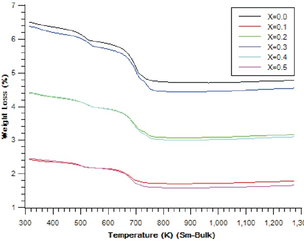 Figure 1. Variation of Weight Loss (%) with Temperature (K) (Sm-Bulk)