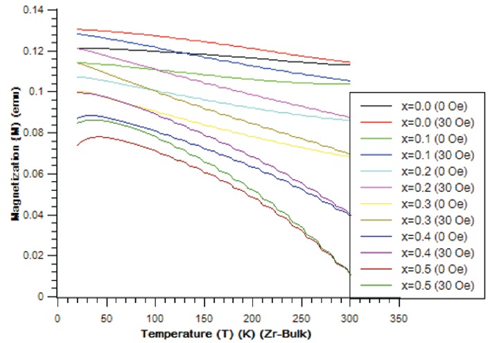 Figure 2 shows one (Zr-Bulk) of the zero field cooled (ZFC) and field cooled (FC=30 Oe) curves of Sm3+/Zr 4+ substituted Mg-Mn ferrites. Table 3 shows the temperature characteristics for both bulk and nano state of the specimen for varying concentrations. Specimens in both the cases (ZFC and FC) heated at zero and 30 field state from the temperature 30 to 300 K and cooled from 300 to 30 K to measure corresponding magnetization (M). It is observed that the saturation magnetization drops slowly as a function of temperature.