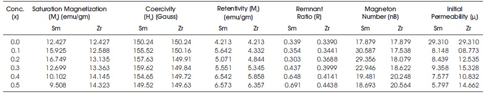 From the obtained magnetic hysteresis loops of the present ferrites, saturation magnetization (Ms), coercivity (Hc), retentivity (Mr), remnant ratio (R) and magneton number (nB) of all the materials are evaluated and presented in the Tables 1 and 2 with the initial permeability (μi). The obtained saturation magnetization is found to be higher for nano ferrites when compared with the bulk particle size ferrite materials. The present un-substituted or basic ferrite saturation magnetization value 12.427 emu/gm shows good agreement with the earlier results (Kumar et al., 2007). It increases with the substituted samarium concentration having maximum at x=0.20 (16.749 emu/gm); further it deteriorates to 9.508 emu/gm with the rise of samarium concentration in bulk size materials. In the case of nano size materials, saturation magnetization increases from 14.571 emu/gm attaining maximum 18.669 emu/gm at x=0.20. The variation of saturation magnetization is found to show similar trend for both bulk and nano-size materials of the samarium substituted Mg- Mn ferrites. The saturation magnetization value is observed to increase from 12.427 emu/gm to 14.323 emu/gm in the bulk size materials of zirconium substituted ferrites. In the case of nano size ferrites, it improved to 18.959 emu/gm from 14.571 emu/gm.