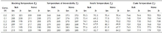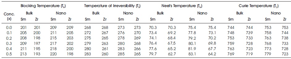 Table 3. Sm3+/Zr 4+ Substituted Mg-Mn Bulk/Nano Ferrites Blocking Temperature, Temperature of Irreversibility, Neel's Temperature and Curie temperature (in K)