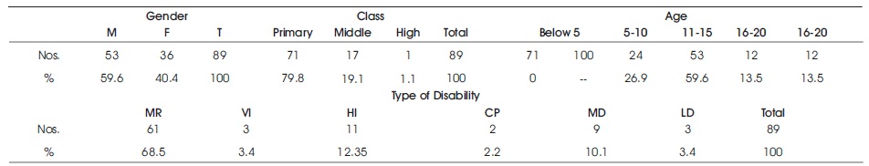 Out of 89 children, the maximum number enrolled in schools were from the category of Mental Retardation (MR) i.e. 61 (68.5%), followed by 10% children with Multiple Disability (MD). Then there were 11 (12.35%) of Hearing impaired (HI) children. Out of the remaining children, they represented other challenges such as Visual Impairment (VI)-3, Cerebral Palsy (CP)-2, and Learning Deficiency (LD)- 3 children.