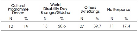 13 (20.6%) of them mentioned about their performance in Giddha/Bhangra on World Disability Day.