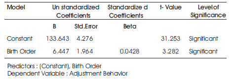 Table 11 shows that the ' t ' value for birth order. It reveals that the variable birth order (t = 3.282, significant at 0.05 level) is significantly contributed to the dependent variable adjustment behaviour. To sum up, the following conclusion has been reached in respect to the hypothesis. Birth order influences the adjustment behaviour of adolescent students with visual impairment.