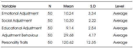In the case of adjustment behaviour, the mean score (Mean=29.68) indicates that the overall behaviour of the adolescent students with visual impairment is found as average. With regard to sub-dimensions, the adolescent students with visual impairment have high educational adjustment (Mean=9.14) when compared to emotional (Mean=10.24) and social adjustment (Mean=10.30) scores. In the case of personality traits, the overall means score (Mean=120.62) indicates that the adolescent students with visual impairment have average personality traits.