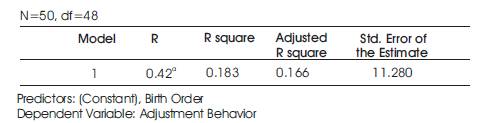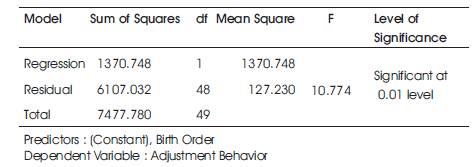 Table 9 shows the R square value, which is found to be 0.183. It is evident that only 18.3 % of the total variance in adjustment behaviour is attributed by the independent variable such as birth order of adolescent students with visual impairment.
