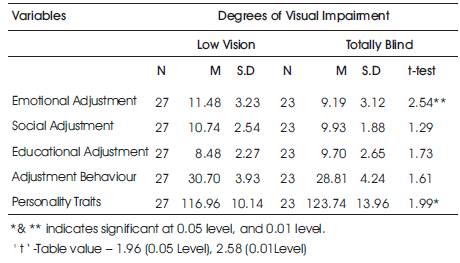 From Table 2, it is evident that the calculated t-value 2.54 is greater than tabulated t-value 1.96. Therefore the null hypothesis is rejected and alternative hypothesis is retained. It is significant at 0.05 levels in the case of emotional adjustment behaviour of adolescent students with visual impairment with respect to their degree of visual impairment. Therefore degree of visual impairment influences the emotional adjustment behaviour. From Table 2, it is also evident that the calculated t-value 1.99 is greater than tabulated t-value 1.96 and it is significant at 0.05 levels in the case of personality traits of adolescent students with respect to their degree of visual impairment. Therefore degree of visual impairment influences the personality traits too. It is well known that, with regard to degree of visual impairment, it has significant influence on the emotional adjustment behaviour and personality traits of adolescent students with visual impairment and has no significant influence over the social adjustment, educational adjustment, and adjustment behaviour in total based on the t-values.