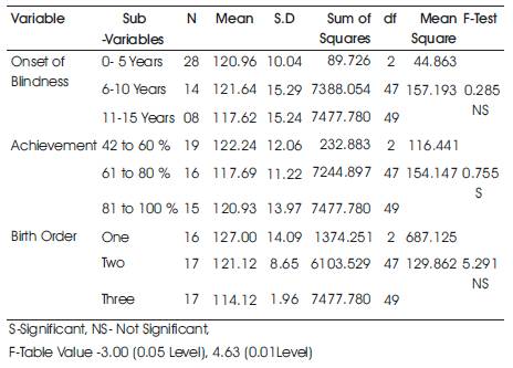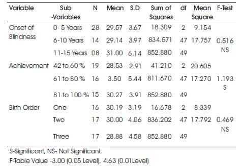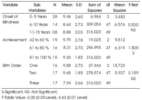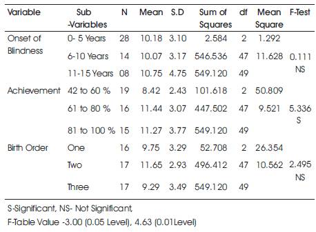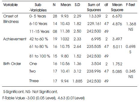 From Table 4, it is evident that the calculated F-values 1.368, 0.698, and 0.345 are lesser than tabulated F-value 3.00 and no significant at 0.05 levels in the case of social adjustment behaviour of visually impaired adolescent students with respect to their achievement. Therefore, it has been concluded that onset of blindness, achievement, and birth order do not have significant influence on the social adjustment behaviour of adolescent students with visual impairment.