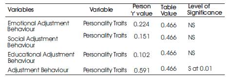In order to find out the significance relationship between the scores of adjustment behaviour and personality traits of adolescent students with visual impairment, Person correlation 'r' was applied and the results are presented in Table 8.