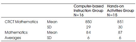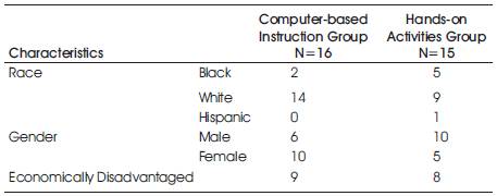 Student participants (N=31) in the study were in the fourth grade, ranged from nine to ten years of age, and were all general education students. The students were divided into two comparable groups based on their ability level for the research study. Students were ranked from highest achievement scores to lowest achievement scores on the Mathematics section of the Criterion Referenced Competence Test from the previous school year. The teacher-researcher created two groups, ‘a computer based instruction group’ and ‘a hands-on activity group’, with equal ability levels using the students' ranking. The computer-based instruction group received multiplication practice from computer programs. The hands-on activity group participated in hands-on multiplication games. The demographics of the groups are shown in Table 1.