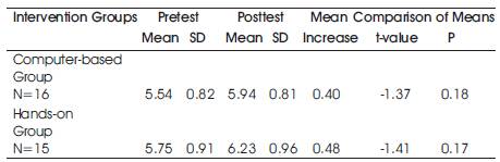 The mean increase for the computer based instruction group and the hands-on group was not statistically 2. It was 0.51 on students’ achievement scores who participated in the computer-based group intervention and 0.53 on students’ achievement scores who participated in the hands-on group intervention. Adding each students’ achievement scores within the specific intervention group and dividing the sum by the total number of participants calculated the mean for the computer-based instruction group, and the hands-on students in the hands-on activity group responded to the students' perceptions survey questions using a Likert-scale that ranged from 1 (strongly disagree) to 5 (strongly agree). The hands-on activity group's responses to the students' perceptions survey are shown in Table 4.