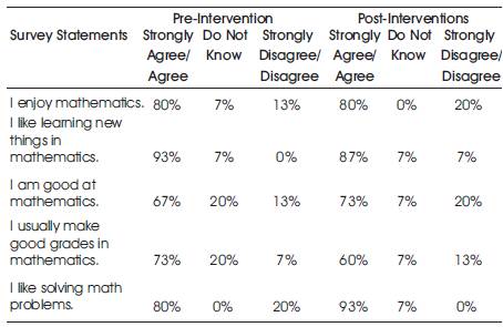 In order to answer the research question two, the teacherresearcher administered a perception survey prior to the intervention period and at the conclusion of the intervention period. The results of the students' perceptions survey showed that, over 56% of the students in both the hands-on group and the computer-based instructional group responded ‘strongly agree’ or ‘agree’ to all of the statements on the students' perceptions survey. The results of the students' perceptions survey showed that, majority of the students had positive attitudes towards mathematics prior to the intervention period as well as at the conclusion of the intervention period. Results did show a positive impact of the interventions on students' responses to the statements “I am good at math and I like solving math problems” as shown in Table 4.