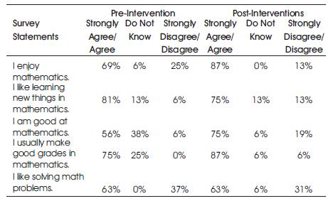 Students' responses indicated that, over half of the students in the hands-on intervention group enjoyed mathematics prior to the seven-week intervention period and at the end of the seven-week intervention period. The percentage of students who agreed with each statement at the beginning of the seven-week intervention period decreased after the implementation of the intervention on all of the survey statements except, ‘I am good at mathematics’ and ‘I like solving math problems’. After the seven-week intervention period, the students' responses in the hands-on group showed that, they had more confidence related to mathematics and enjoyed mathematics. Students' responses indicated that, some students no longer enjoyed learning new things in mathematics and they felt that, they did not make good grades in mathematics after the seven-week intervention period.
