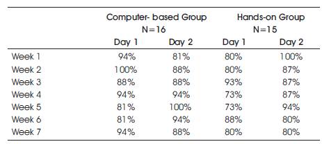 The majority of students in the computer-based instructional group and the hands-on instructional group were consistently engaged throughout the entire fifteen minute intervention period. The computer-based instructional group's and the hands-on instructional group's engagement data are displayed in Table 7.