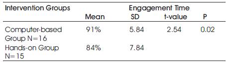 In order to answer the third research question, an engagement checklist was completed by the teacherresearcher twice a week during the seven-week intervention period. Students' time on-task and off-task was recorded. Off-task behaviors included talking to students in other groups, leaving group or assignment, or completing other tasks. The results from the engagement checklist showed that students in the computer-based instruction group were significantly more engaged throughout the intervention periods than the students who participated in the hands-on multiplication games.