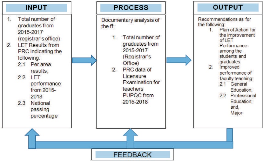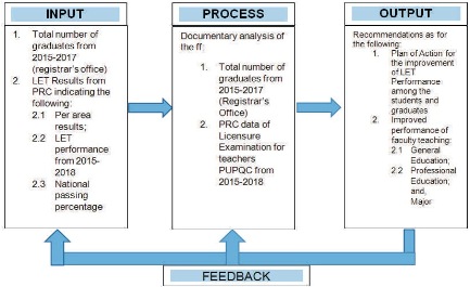 The present study made use of the Input-Process-Output Scheme of environmental scanning. Figure 1 contains the Input Box indicated the number of graduates as requested from the PUPQC Registrar's office, LET results requested from the Professional Regulation Commission (PRC), which indicated the per area results; LET performance from 2015- March 2018 and, National Passing Percentage. Likewise, Process Box contains the documentary analysis which the researchers utilized and the Output Box for which the study intends to produce such as: Plan of Activities for the improvement of the Licensure Examination Result, such as Continuing Faculty Development Program, maximizing field study courses for review, expand the utilization of national diagnostic assessment, incorporating seminars as part of the requirements of the students, and encouraging students to take National Certification Examination in TESDA.