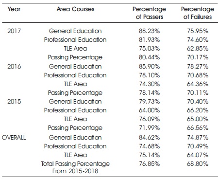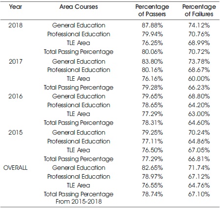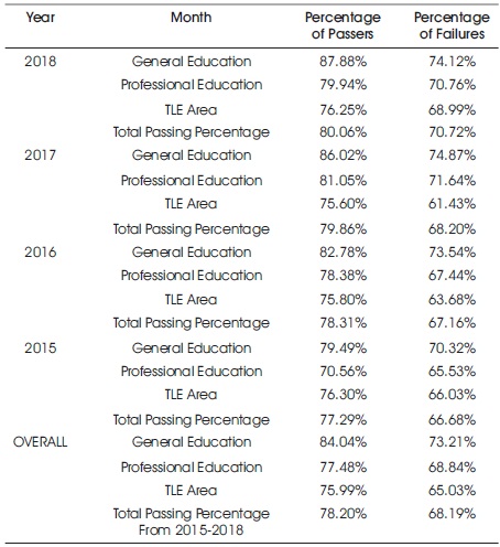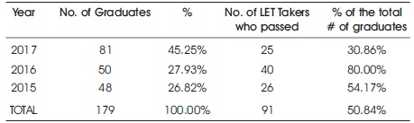 Table 1 presents the total number of graduates from 2015- 2017 and those who took and passed the Licensure Examination for Teachers from 2015-2018.