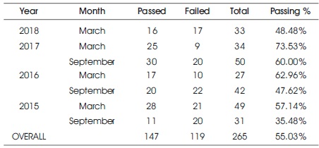 The highest percentage rating was on 2017 of March, registering 73.53% with 25 passers from 34 aspirants and the lowest passing percentage rate is 35.48% in 2015 of September, only 11 successful examinees out of 31 aspirants. The overall passing percentage rating was only 55%, 147 out of 265 aspiring professional teachers.