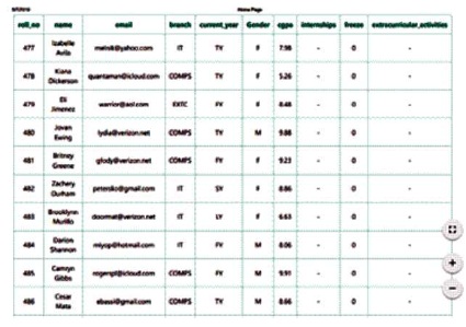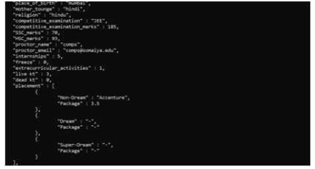Figure 6 for faculty home page, which renders the unstructured data shown in Figure 5. Unstructured storage helps in storing multiple nested values with ease. It is an extended version of the student home page where the faculty will be able to view the data of all the students in the database as opposed to the student home page, where the student will only be able to view his data and no other student's data. Also, the faculty will be provided with the search option along with the filtering functionality. The filtering functionality with its pre-defined filter strings will allow the faculty to filter out the student data depending upon the requirements. Figure 7 shows the student home page layout. The students after logging in to the application will be directed to their homepage. On the homepage, they will be able to see all the data pertaining to them such as personal details, academic details, extracurricular and co-curricular details in sectional format.
