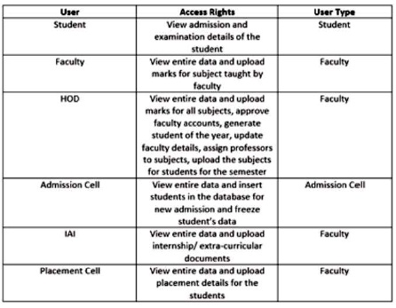 Since there are many users, each with their user rights hence, they will also have access rights to the system. This is important from a security standpoint. No user will be given full access to the system's data. Figure 1 shows the access rights to the systems data as per the user.