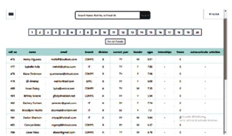 The application provides the user with search of a record based on the name, roll number, and email address of the student. The search requests are fulfilled using AJAX call made to the server and the response is displayed in the format of a table, which is easy for the user to read and distinguish the necessary details. The filters are provided with easy search of the necessary details for the user. The filters are based on department of the student, the current year of the student and the cgpa of the student and others. The application supports printing the data displayed on the web page as a document in user readable format.