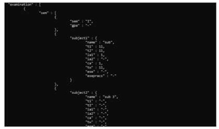 Figure 9 shows the student examination details. Figure 8 shows the unstructured format for storage of the examination details in the database. Referring to the unstructured data the data is highly nested, which is rendered to a structured format for ease of view to the user.