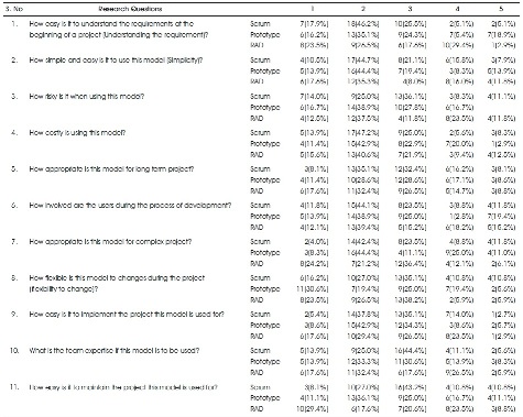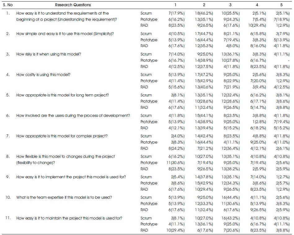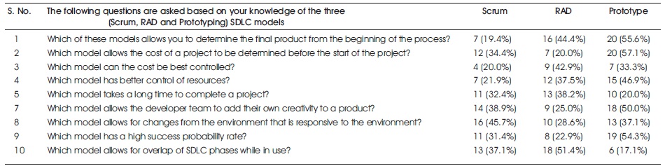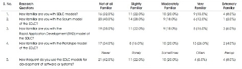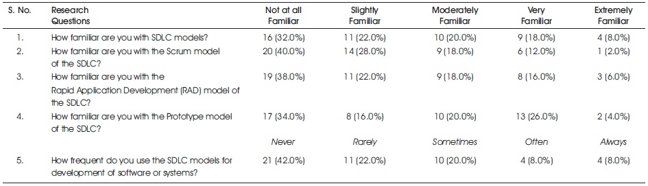 A structured questionnaire titled “A Survey Questionnaire for Software Development Life Cycle (SDLC) Models" has been used to gather information from the subjects. The choice of this instrument has been prompted by its reliability and validity of the answers. The instruments consist of five sections: A, B, C, D and E. Section A sought data on how familiar the respondents are with SDLC models and the Scrum, RAD and Prototype models of the SDLC. Section B requested data on the respondent's knowledge of the three SDLC models. They were allowed to vote for more than one of the models in each variable. These variables are determination of the final product and cost from the beginning, cost control, resource control, duration for the project to be completed, addition of the developer's creativity, responsiveness to changes from the environment, success probability rate and the model that allows overlapping. They were required to pick between the three models as compared with the other models. Section C contained software solution and the respondents were asked to pick which is the most suitable. They were allowed to vote for more than one of the models in each variable. Some of the software solutions asked are Tacker system, Student portal, Transportation System portal, Hospital management portal, Educational applications, Online calendar, Journal Processing and validation, Oil and gas applications, Chemical product costing, Online recruitment, Man power utilization tracking, E-commerce applications, Blogs, Android Applications, Mobile Recharge applications, Fingerprint based applications, Encryption applications, Online Electoral portal, Online booking applications, Online ordering applications, Customer reviews applications, Instant messaging applications. Section C also contained questions that were used to determine the frequency of ICT usage. The respondents were required to tick each item in the appropriate column that mostly represents their opinion based on their degree of agreement or disagreement with the statement. Section D looked into how often the models are being used by developers. Section E which has been measured on a Likert scale of agreement having the value from 1 to 5 sought to understand and know which models performs best with the following variables; understanding the requirement, simplicity, risk involved, cost, long term project, user participation, complexity of project, flexibility to change, ease of implementing, team expertise, ease of maintaining the project.