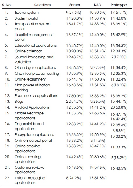 RAD is preferred in the following projects; online calendar (51.4%), online recruitment applications (50%), man power utilization tracking (51.5%), mobile recharge applications (63.6%), encryption applications (55.9%), online booking applications (47.1%), online ordering application (60.6%), customer review applications (57.6%), instant messaging applications (51.1%).