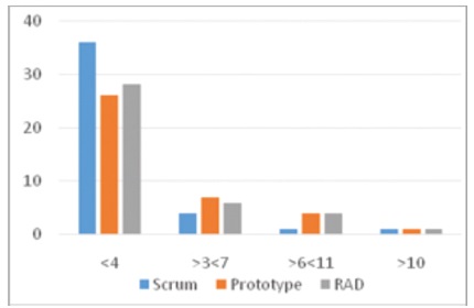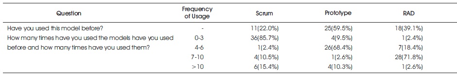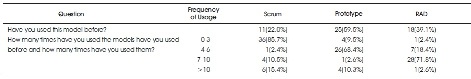 Table 4 shows how frequent each model has been used. The graph showing the frequency of usage of model 1 and 2 is shown in Figures 5 and 6 respectively. The graph showing the frequency of usage of model 1 and 2 is shown in Figures 5 and 6 respectively. Prototype has been used more than the other models. Prototype has a 59.9% vote followed by RAD (39.1%) and scrum (22%). It is seen that only 1 respondent for each of the model has used the models more than 10 times. 10.5% and 10.3% of the respondents have used the prototype and the RAD models respectively between 7 to 10 times, while only 2.4% have used the scrum model within this range. Within the range of 4 to 6, 18.4% of the respondents have used the prototype, 15.4% have used the RAD while only 9.5% have used the scrum. Scrum have the highest vote for the range 0-3 times with a percentage of 85.7% followed by RAD (71.8%) and finally prototype (68.4%).