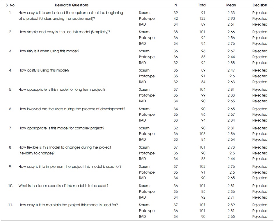 This work then compared the variables with each other and discovered that scrum is considered to be more flexible to change, easy to implement, require high team expertise and easy to maintain than the others. For prototype, it is appropriate for complex and long-term project and it is easy to understand the requirement at the beginning of the project than the others. For RAD, it is simple and easy to use the model, but it is risky and costly when using this model and it allows for users involvement during the development process more than the others.