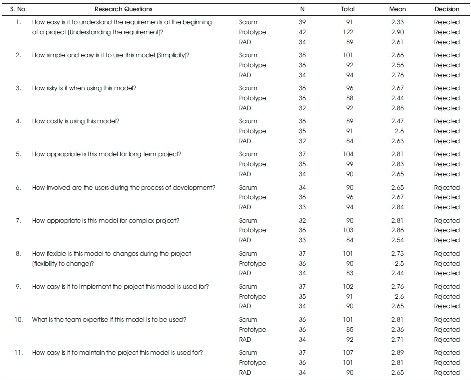 Table 5 shows the analysis of the models based on the Likert scale of agreement. For ease of understanding the requirement, Table 6 shows the decision table for the variables.