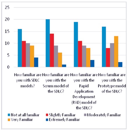 Table 1 shows the analysis of the result obtained as regards as the familiarity of the respondents with the SDLC models. It is seen that 32% of the respondents are not familiar with SDLC models at all, 22% are slightly familiar, 20% are moderately familiar, 9% are very familiar and only 4% are extremely familiar with the SDLC models. For the scrum model, only 2% of the population are extremely familiar, 12% are very familiar, 18% are moderately familiar, 28% are slightly familiar while 40% are not familiar at all. For RAD, 38% are not familiar at all, 22% are slightly familiar, 18% are moderately familiar, 16% are very familiar while 3% are extremely familiar. For the prototype, 34% are not familiar at all, 16% are slightly familiar, 20% are moderately familiar, 26% are very familiar while 4% are extremely familiar with the model. Figure 1 indicates the familiarity with SDLC models. Frequency of the usage of SDLC model is given in Figure 2.