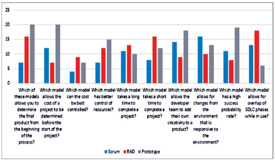 Table 2 shows the analysis of some of the variables to determine which of the models is suitable for a particular condition (the data visualization is shown in Figure 3). For the question asked which of the models allows you to determine the final product from the beginning, prototype has 55% vote, RAD has 44.4% and scrum has 19.4%. It can be seen that majority voted for prototype. For cost determination before the start of the project, prototype has the highest vote of 57.1%, followed by scrum with 34.4% while RAD has 20% vote.