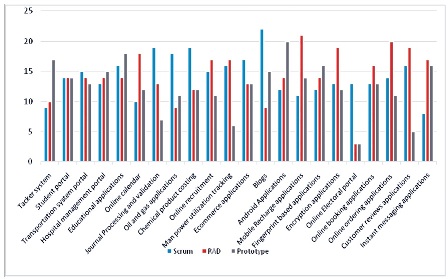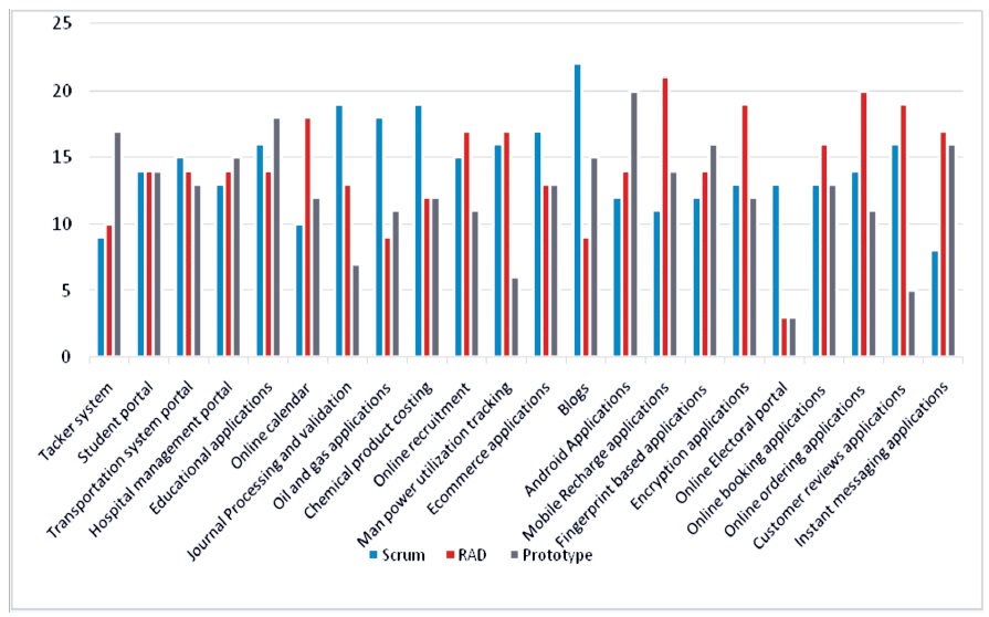 Table 3 shows the efficiency of each models in some project. Figure 4 shows the data visualization of the efficiency of SDLC models in projects. From the table, it can be seen that prototype is preferred by the developer in the following project; tracker system (51.1%), student portal (40%), hospital management portal (42.9%), educational applications (54.3%), android applications (58.8%), fingerprint-based application (47.1%). Scrum is preferred in the following projects; transportation system portal (41.7%), oil and gas applications (56.3%), chemical product costing (55.9), e-commerce applications (50%), blogs (54.7%), online electoral portal (38.2%).