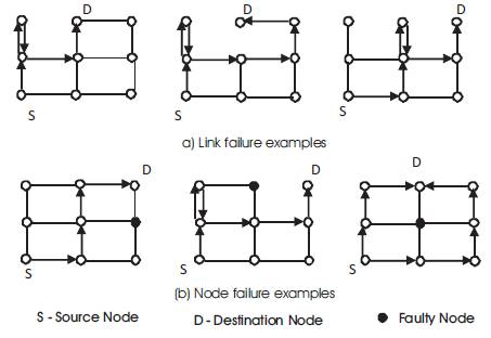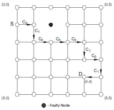 The exponential function R(t) = e-λt can be used to represent the reliability of digital systems. The dimension-ordering Routing (DOR) technique has been used as the basic non-fault-tolerant routing technique in meshes. According to the DOR technique, a message is routed along one dimension at a time in a strict monotonic order on the dimensions traversed. Consider, for example, a 2D mesh network. In this case, messages are routed first along the X-axis and then along the Y-axis. In other words, at most one turn is allowed, namely from X to Y. The DOR algorithm works as follows: Assume that the source node S has dimension (Sx, Sy) and that the destination node D has dimension (dx, dy). The difference in dimension is denoted as (wx = dx - sx, wy = dy - sy ) Wormhole routing is used in routing messages [25, 57]. In other words, a message advances immediately from the incoming to the outgoing channels, given that an outgoing channel is available. Packets are divided into flits (flow control digits) for transmission. The header flit governs the routes, i.e., as it advances along a specific route, the remaining flits follow in a pipelined fashion. According to the DOR the two flits wx and wy are placed respectively in the first two flits of the message. When the first flit arrives at a node, it is either incremented, if it is less than 0, or decremented, if it is greater than 0. If the result of this operation is not equal to 0, then the message is forwarded in the same dimension and direction in which it arrived. However, if the result is 0 and the message arrived on the Y dimension, the packet is delivered to the local node. If, on the other hand, the result is equal to 0 and the packet arrived on the X dimension, the flit is discarded and the next flit is examined upon arrival. If that flit is 0, the packet is delivered to the local node; otherwise, the packet is forwarded in the Y dimension [36]. The X-Y routing has conventionally been referred to as e-cube routing.