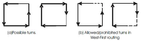 The fundamental concept used in the turn model is to prohibit the smallest number of turns in order to prevent cycles from taking place while routing [12, 22, 50]. Figure 2(a) shows eight possible turns in a 2D mesh network.