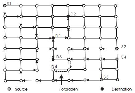As can be seen, in order to prevent cycles in 2D meshes one need to prohibit two of the eight turns. If the two turns to the west are prohibited, the corresponding routing technique is called west-first routing. This is because a given message has to start in the west bound, if necessary, at the source node and then adaptively move south, east, and north [32]. Figure 2(b) shows the six turns allowed (solid lines) and the two turns prohibited (dashed lines) in the case of west first routing in a 2D mesh. Similar routing techniques, e.g., north-last, and negative-first can be found in [32]. Figure 3 shows three examples (Source S1 to destination D1, S2 to D2, and S3 to D3) routing of messages using the west-first routing algorithm under the link fault model in a 2D mesh. As can be seen in Figure 3 the path followed between a source and a destination node is not minima in terms of the number of hops (links) traversed. It should be noted that there are faulty cases under which routing may not be possible under the turn model. The case of messages sent from source node S4 to destination node D4 in Figure 3 is one such case. It should also be noted that because cycles are eliminated, the west – first routing is deadlock-free.