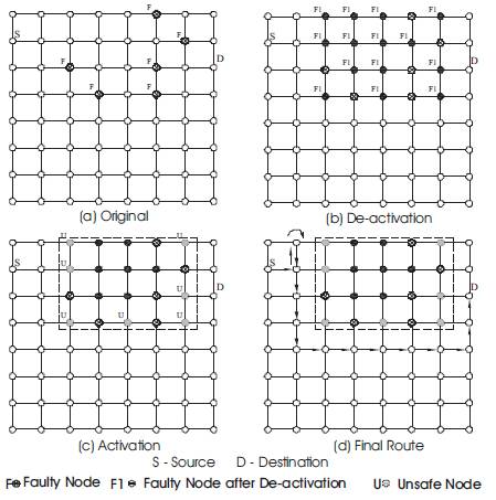 The technique starts by applying the NDR to transform faulty regions to rectangular regions. The algorithm then proceeds by applying the NAR in order to activate deactivated nodes residing at the boundaries of faulty regions. It should be noted that the technique may require repetitive application of the NDR. Figure 4 demonstrates the application of the node labeling scheme and the routing of a message around the faulty regions in order to reach the destination. It should be noted that only node fault model is assumed in Figure 4 (links are assumed to be perfect).