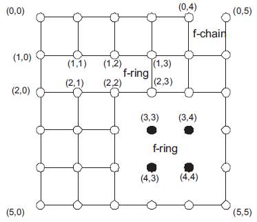 For each f-region in a network with faults, it is feasible to connect the fault free components around the region to form a ring or chain. The faulty ring or f-ring of a given region consists of the fault-free nodes and links that are adjacent (row-wise, column-wise or diagonally) to one or more components of the fault region. An f-chain is formed from connected fault-free components around fault region that touches one or more boundaries of the network. A set of fault rings is said to overlap if they share one or more healthy links. Figure 5 illustrates the concepts of f-ring and f-chain.