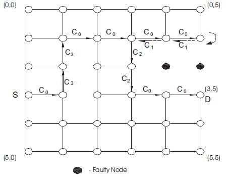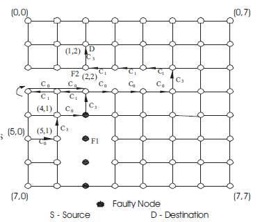 Figure 9 shows an example for f-cube3 in a 2D mesh between source node S (5,0) and destination node D (1,2) [45].