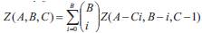 denotes the number of ways in which A identical objects can be placed in B boxes such that each box has at most C objects and R(t) = e-λt is the reliability of a node.